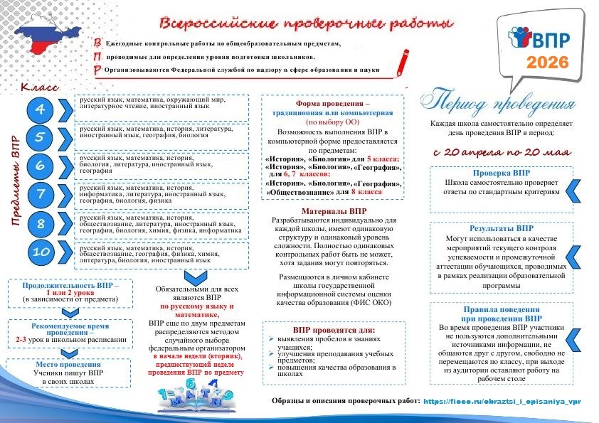 - Об утверждении состава участников, сроков и продолжительности проведения всероссийских проверочных работ в образовательных организациях, осуществляющих образовательную деятельность по образовательным программам начального общего, основного общего, среднего общего образования, а также перечня учебных предметов, по которым проводятся всероссийские проверочные работы в образовательных организациях, осуществляющих образовательную деятельность по образовательным программам начального общего, основного общего, среднего общего образования, в 2025/2026 учебном году