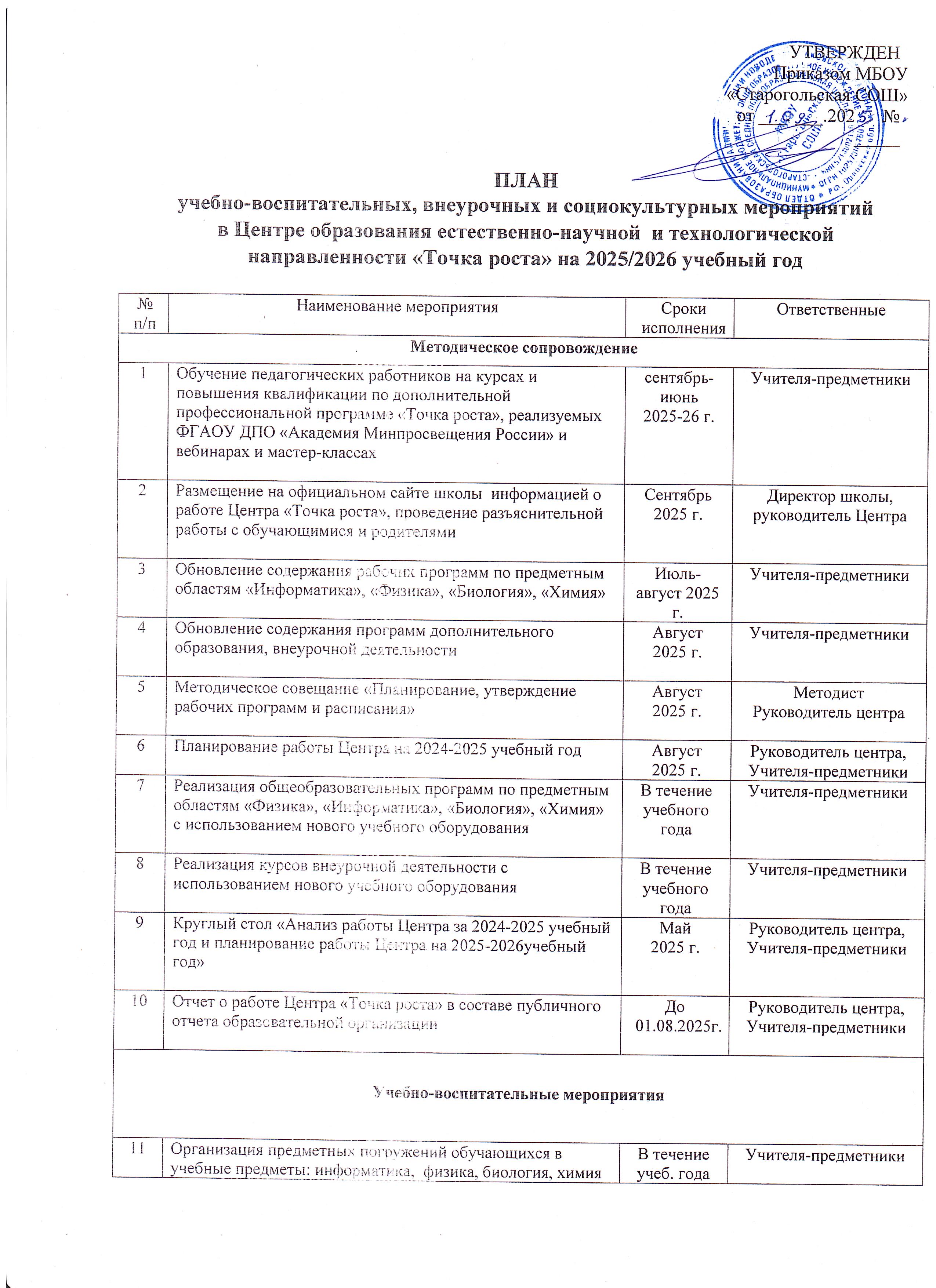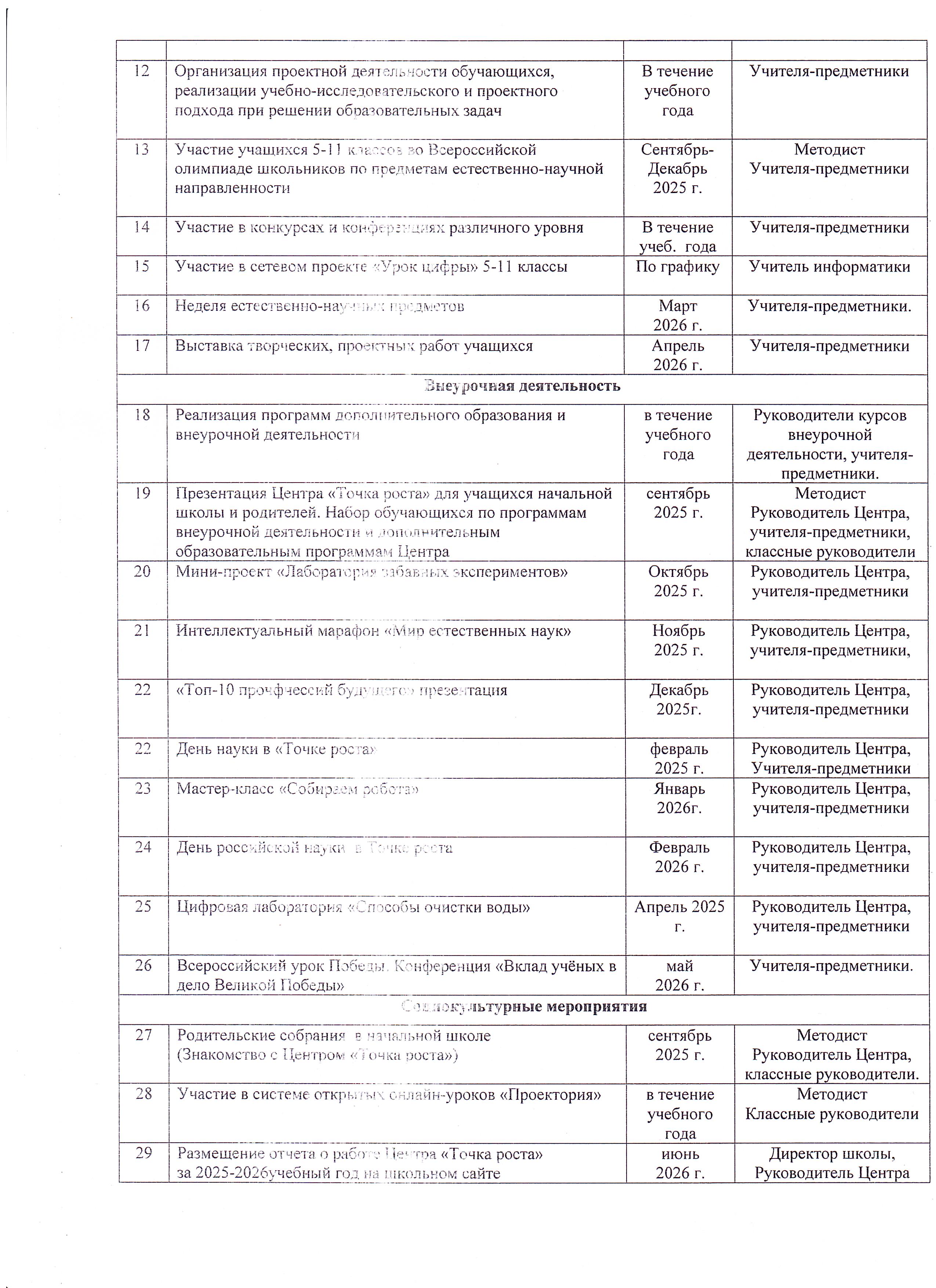 ПЛАН учебно-воспитательных, внеурочных и социокультурных мероприятий в Центре образования естественно-научной и технологической направленности «Точка роста» на 2025/2026 учебный год