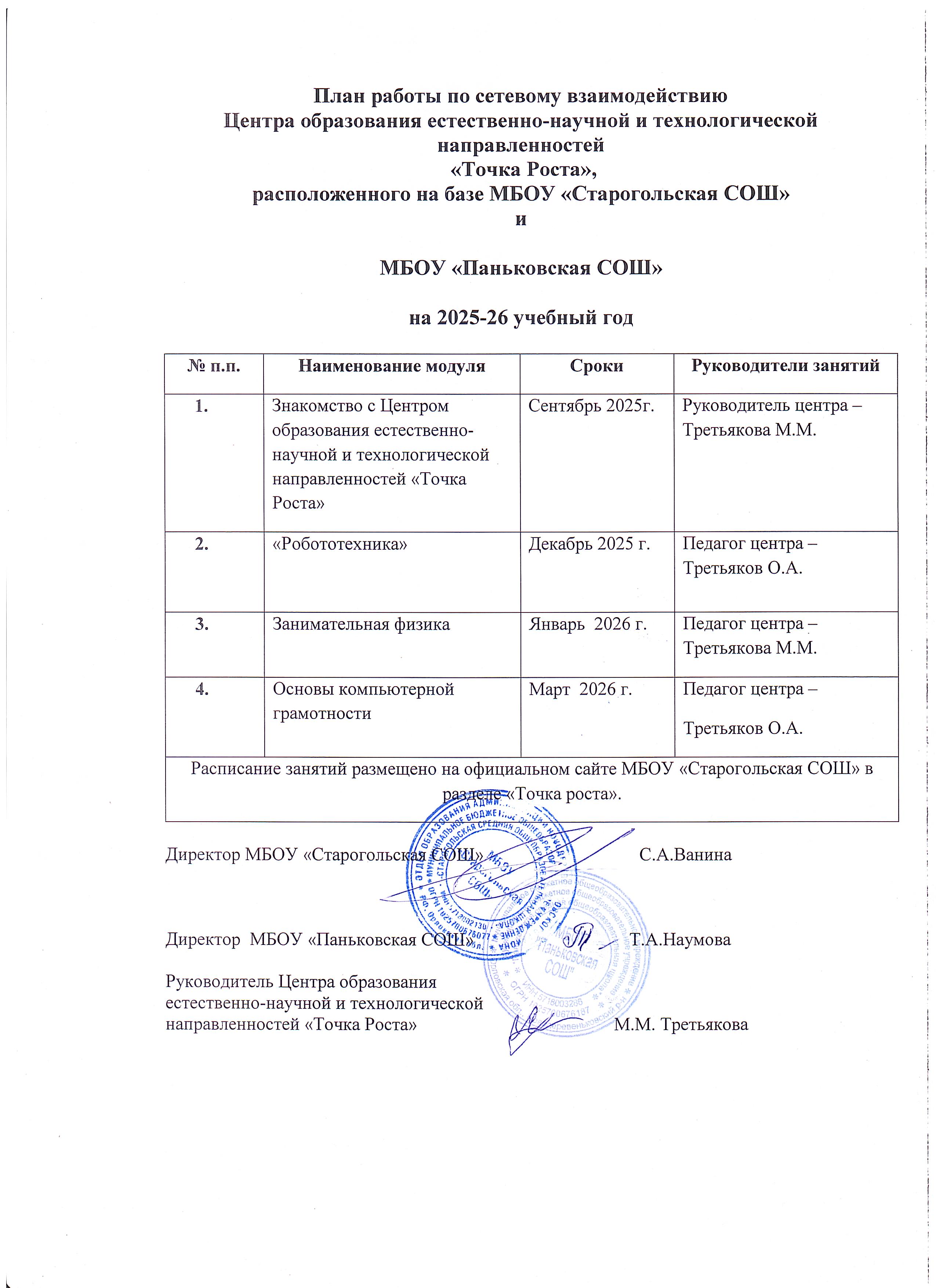 План работы по сетевому взаимодействию Центра образования естественно-научной и технологической направленностей «Точка Роста», расположенного на базе МБОУ «Старогольская СОШ» и МБОУ «Паньковская СОШ».